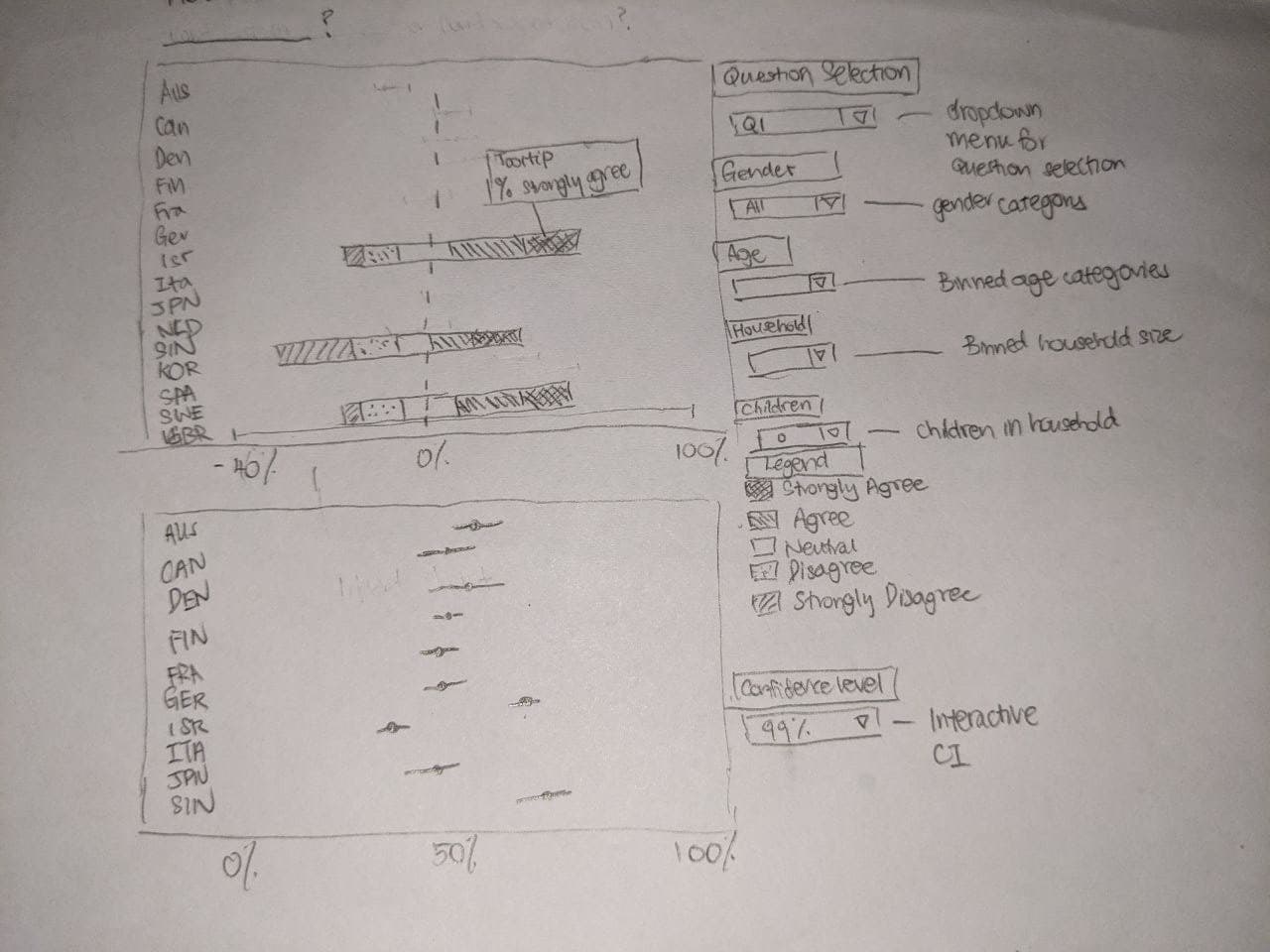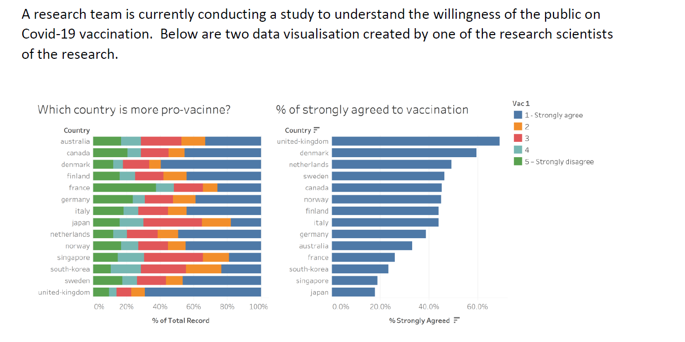 Both charts are sorted differently, with Chart 1 (general response chart) being sorted alphabetically by country, while Chart 2 is sorted by percentage of strongly agrees. As they are put side-by-side, users may misinterpret that the Y-axis categories are the same.