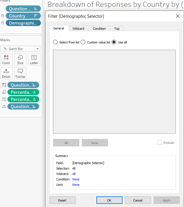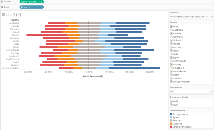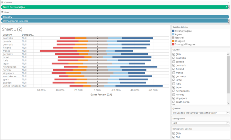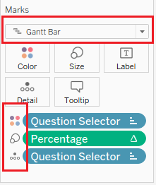 | 15 | Add Question selector to Detail and Colour, Percentage to Size, and change the graph type to Gantt Bar. | ![]() |