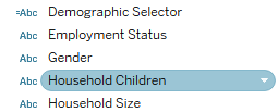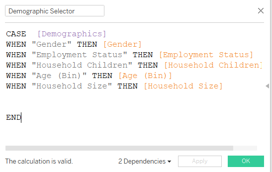 | 20 | Create a Calculated Field that sets the correct demographic case when the associated variable is selected. | ![]() |