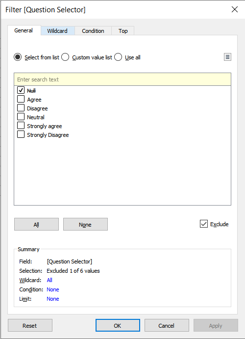 | 27 | Add a filter to exclude Null replies for the Question Selector variable if any. | ![]() |