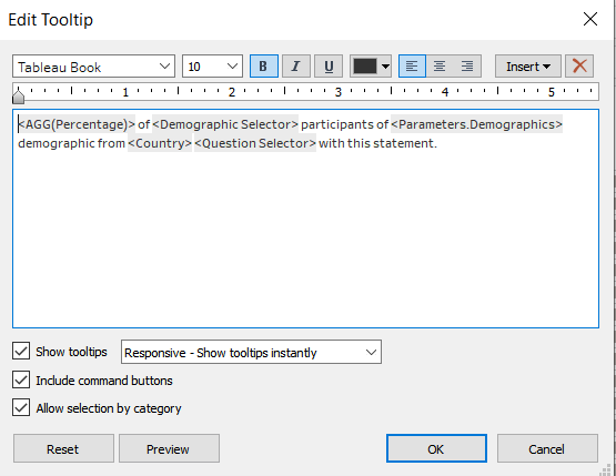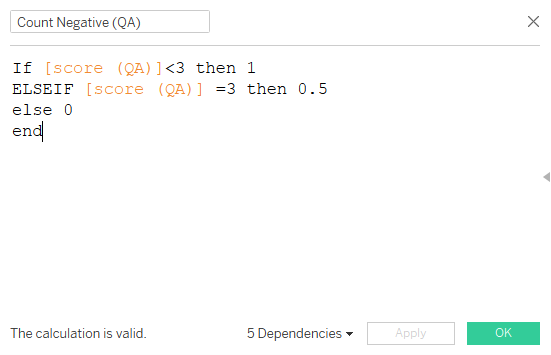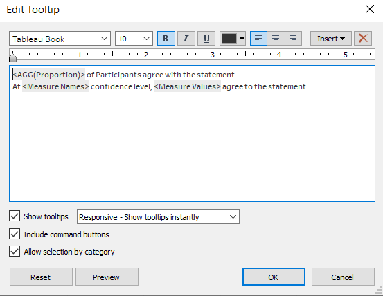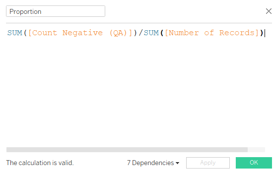 | 1 | Create a Calculated Field called Proportion with the following formula. This is to find the number of respondents that gave a Strongly Agree or Agree score. | ![]() |