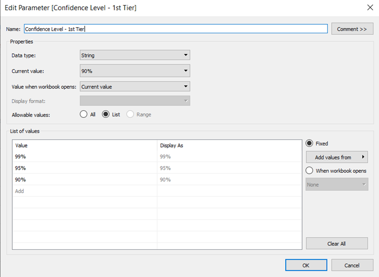 | 4 | Create a Parameter to select desired confidence level. Keep data types as String and list out the various confidence levels that were created in the previous step. | ![]() |