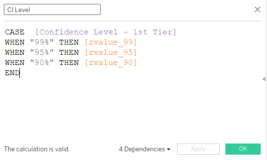 | 5 | Create a Calculated Field to select for the confidence level input with the following formula | ![]() |