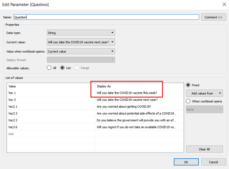 | 4 | Create a new parameter field for question selection. Use the list function and list out the relevant questions as variables. Key in text fields in the Display As column to explain the questions for more clarity. | ![]() |