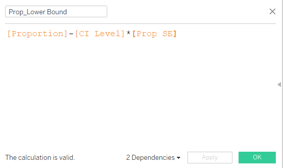 | 2 | Create a Calculated Field called Prop_SE with the following formula. This is to find the standard error for the uncertainty of the proportion. | ![]() |