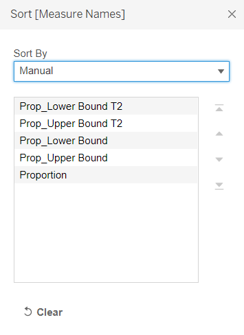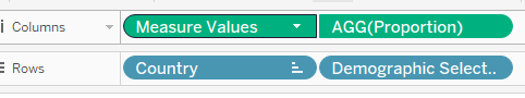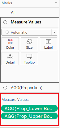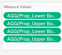 | 9 | Drag Measure Values into the Columns tab and remove all irrelevant information, leaving only Prop_Lower Bound and Prop_Upper Bound. | ![]() |