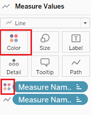 | 10 | Change the chart to a line graph, then drag Measure Names into the Detail Tab. Change Measure names from a Detail to a Path. | ![]() |