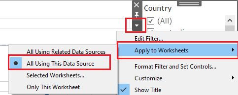 | 2 | Select the arrow for the Country Parameter, go to Apply to Worksheets sub-menu and ensure that the All Using This Data Source option is selected. This will ensure that this Parameter can control both visualisations. Repeat step for other relevant parameters that have been included. | ![]() |